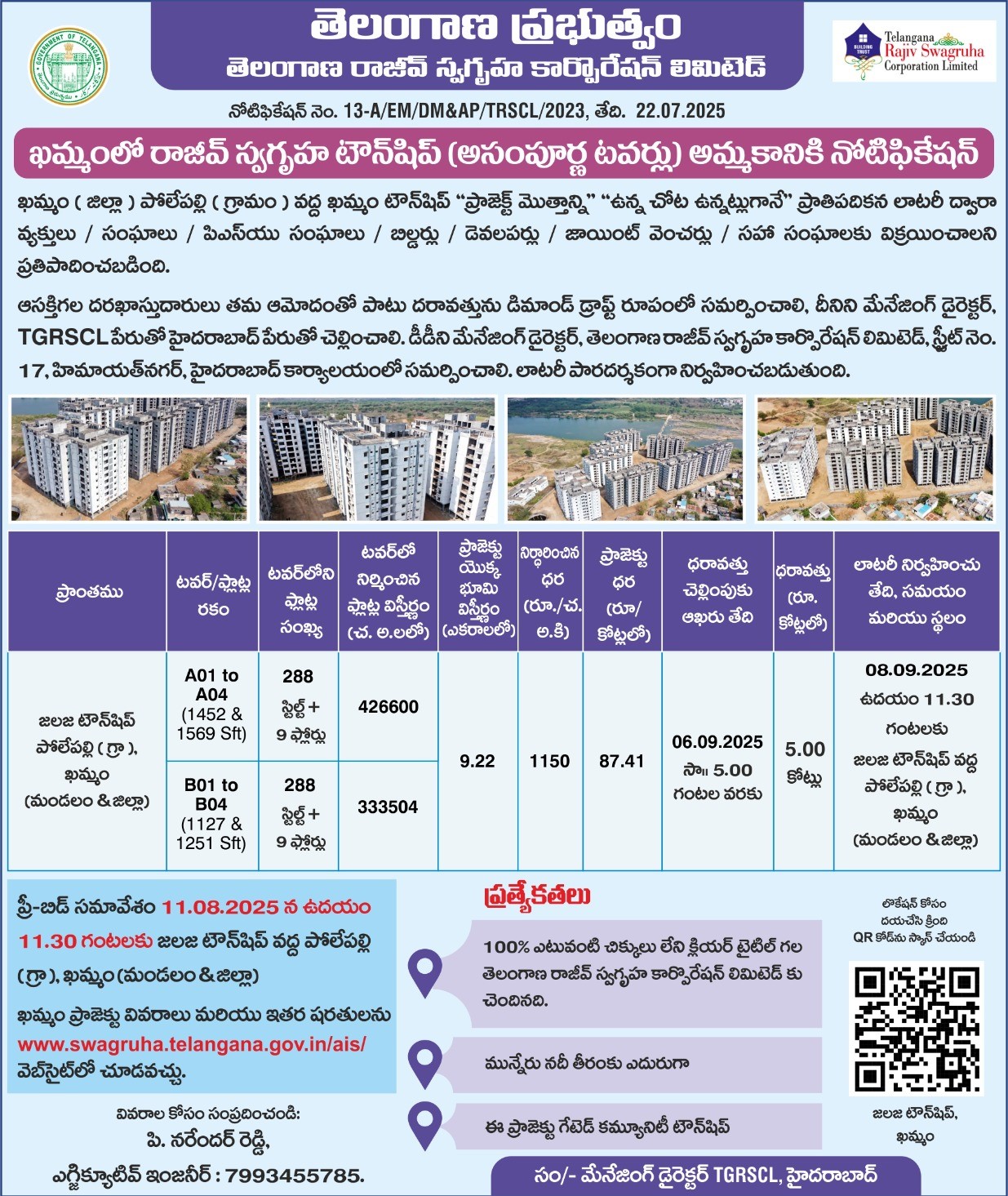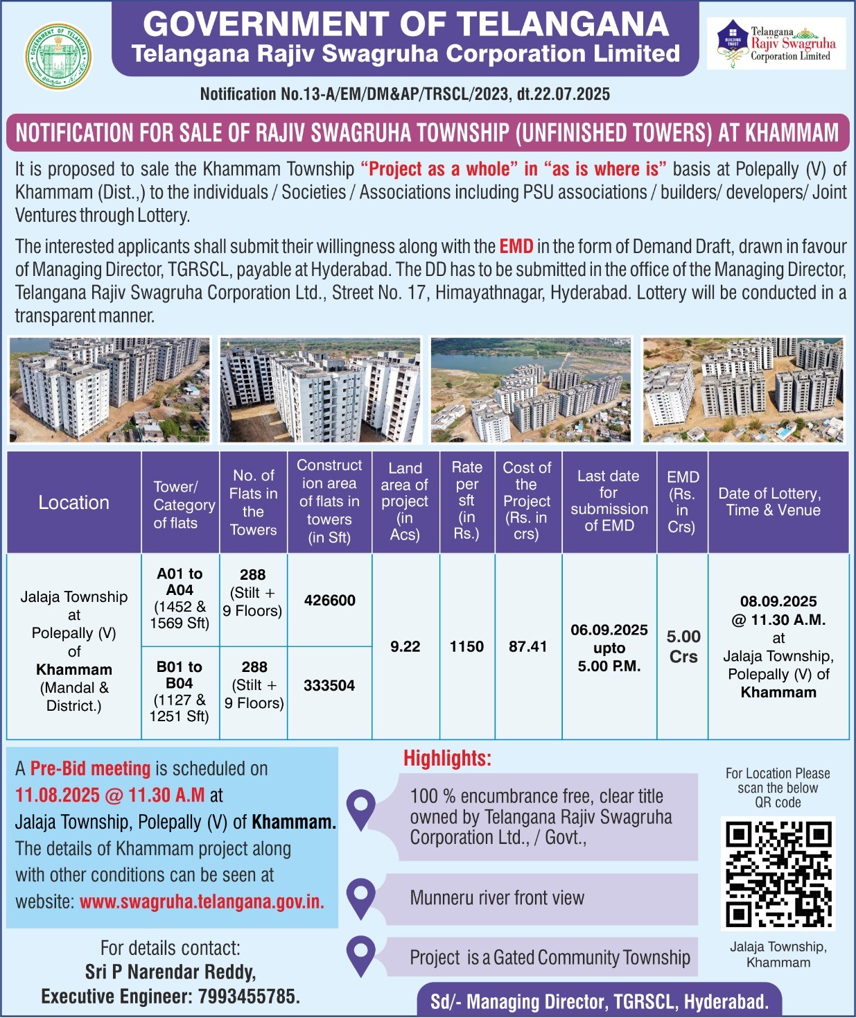 Notification for Sale of Rajiv Swagruha Townnship (Unfinished Towers) at Khammam